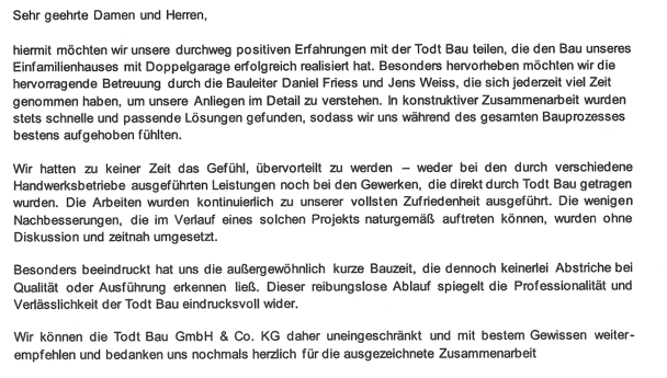 Die Bauleitung durch Herrn Weiss war geprägt von einer sehr freundlichen, kompetenten und korrekten Zusammenarbeit. Wir würden wieder mit Todt bauen und stehen gerne für Referenzauskünfte zur Verfügung.